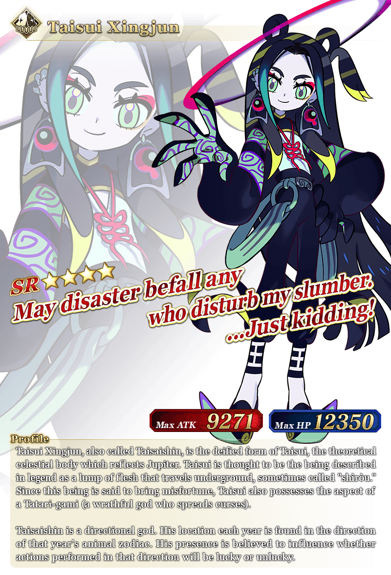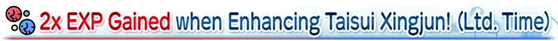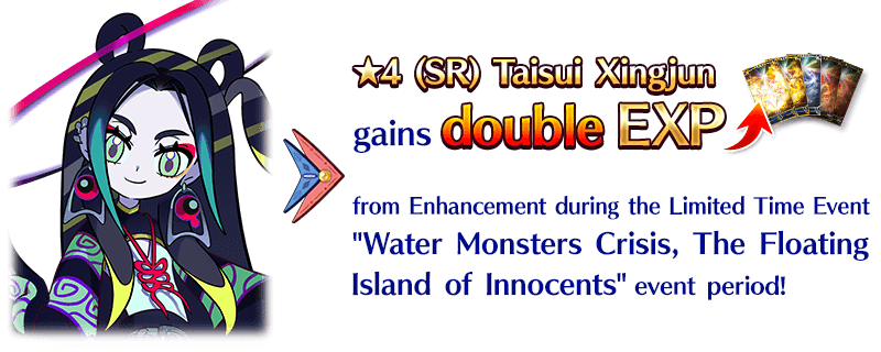 For the duration of the event period, ★4 (SR) Taisui Xingjun will receive double EXP when performing Enhancement.