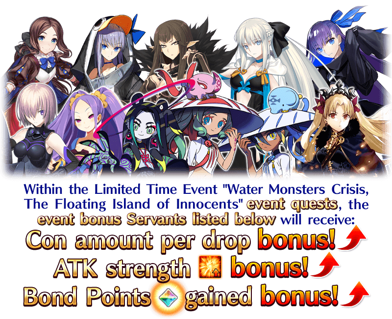 For the duration of the event period, the Servants listed below will receive a Con Gained bonus, an ATK Strength bonus, and a Bond Points Gained bonus!