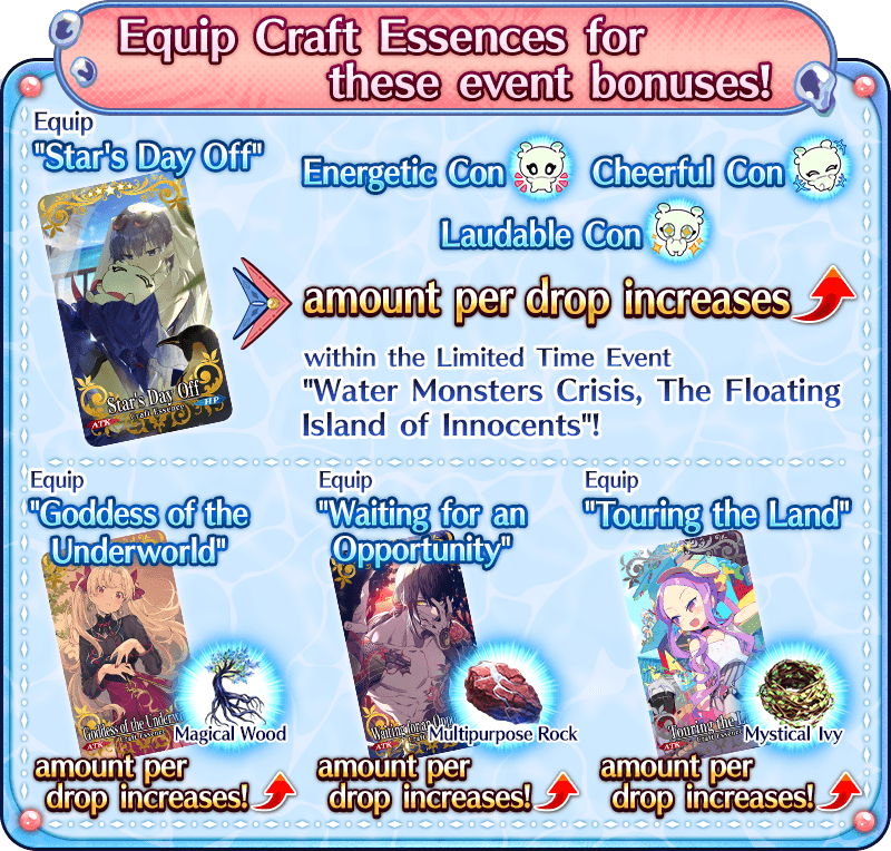 Equip the Event Limited Craft Essence "★5 (SSR) Star's Day Off", available through Event Item Exchange, to receive a bonus to the amount of Energetic Con, Cheerful Con, and Laudable Con per drop within the Limited Time Event "Water Monsters Crisis, The Floating Island of Innocents".