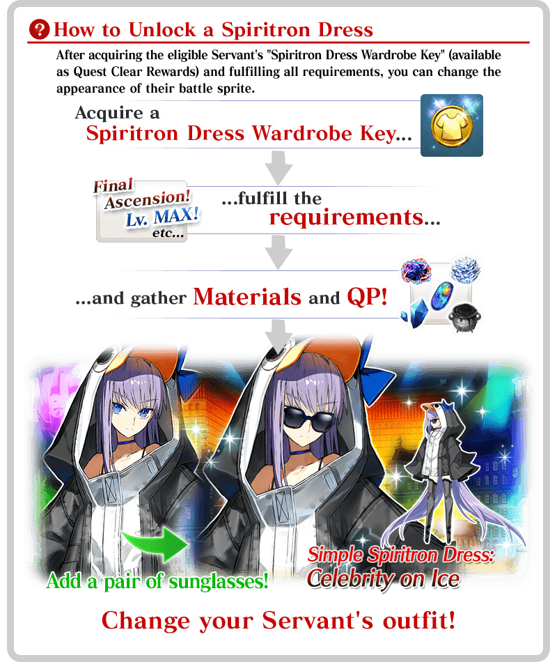 * Upon unlocking a Spiritron Dress, the Servant's battle sprite and icons will automatically be changed. You can revert back to the original appearance or change to a different Ascension level from the Servant Details screen. * "Unlock Wardrobe" will only change the eligible Servant's appearance and voice lines. Their class and all other parameters will remain the same.