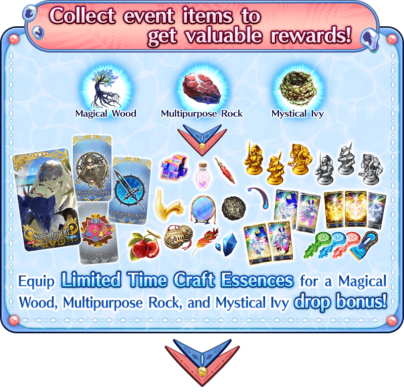 Plus, equip the Limited Time Craft Essences available for Pickup in Saint Quartz Summon for event item drop bonuses. "★5 (SSR) Goddess of the Underworld", "★4 (SR) Waiting for an Opportunity", and "★3 (R) Touring the Land" will grant bonuses to the amount of Magical Wood, Multipurpose Rock, and Mystical Ivy per drop, variously.