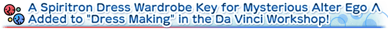 The Simple Spiritron Dress "Celebrity on Ice" Wardrobe Key for ★4 (SR) Mysterious Alter Ego Λ, originally available in the 2021 Limited Time Event "All In! Las Vegas Championship Match - Seven Duels of Swordbeauties!" and the 2022 Limited Time Event "Revival: All In! Las Vegas Championship Match - Seven Duels of Swordbeauties! Lite", will be added to "Dress Making" in the Da Vinci Workshop!