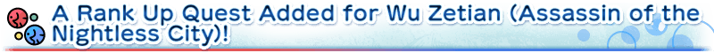 A Servant Rank Up Quest to strengthen ★4 (SR) Wu Zetian (Assassin of the Nightless City) will be permanently added to Chaldea Gate.