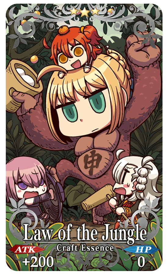 ★★★R Law of the Jungle ATK 200 (MAX: 1000) HP 0 Skill Increase the amount of QP earned by 2017 when completing quests |