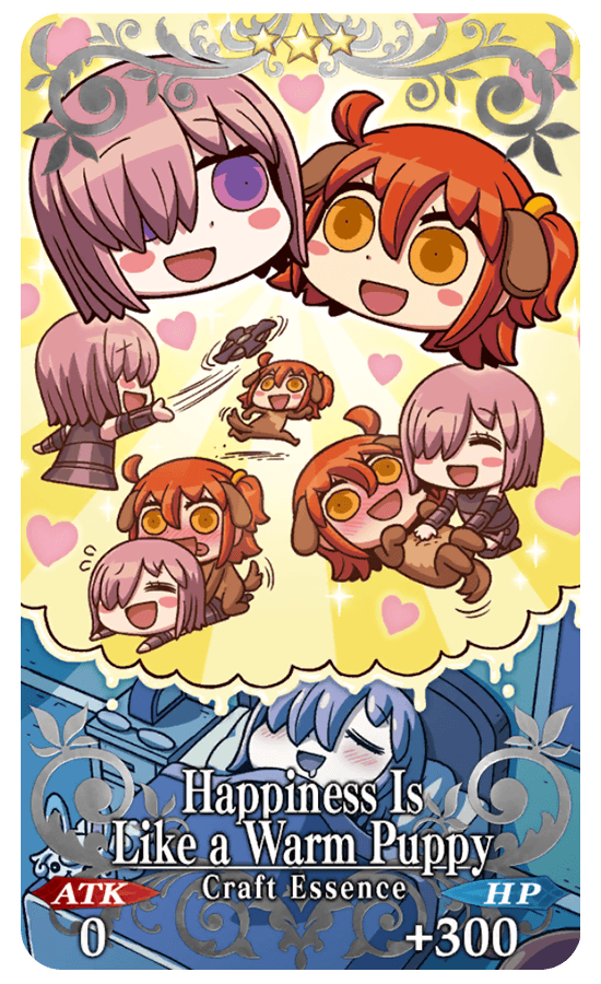 ★★★R Happiness Is Like a Warm Puppy ATK 0 HP 300 (MAX: 1500) Skill Increase the amount of QP earned by 2020 when completing quests |