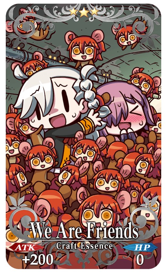 ★★★R We Are Friends ATK 200 (MAX: 1000) HP 0 Skill Increase the amount of QP earned by 2022 when completing quests |