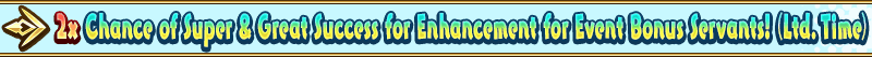 During the period below, the chance of Super Success (double EXP acquired) and Great Success (triple EXP acquired) for Enhancement of Event Bonus Servants from the "Learning with Manga! FGO" x Fate/Grand Order Collaboration Event will be doubled!