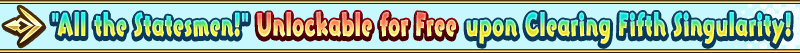 * Users that have already exchanged for "All the Statesmen!" in "Exchange Rare Prisms" will be refunded the Rare Prisms they spent on the exchange through their Present Box upon meeting requirements for free exchange. * Going forward, users that exchange Rare Prisms for "All the Statesmen!" in "Exchange Rare Prisms" before they meet the requirements for free exchange will also receive the Rare Prisms they exchanged back through their Present Box upon completing Main Quest Part 1 "Fifth Singularity: North American Myth War, E Pluribus Unum".
