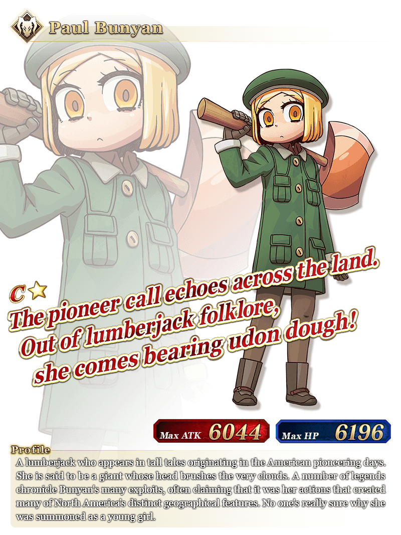 Each time you clear an event quest within sections 1 through 5 of "All the Statesmen! Learning with Manga: The History of the American Frontier", you will receive one copy of ★1 (C) Paul Bunyan (Berserker of Learning with Manga).