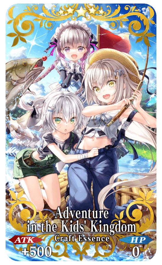 ★★★★★SSR Adventure in the Kids' Kingdom ATK 500 (MAX: 2000) HP 0 Skill Apply Ignore Invincible & increase Critical Strength by 15% & increase NP Gain by 15% for yourself + Increase amount of Antique Reel per drop by 1 [Event Only] Max Limit Break: Apply Ignore Invincible & increase Critical Strength by 20% & increase NP Gain by 20% for yourself + Increase amount of Antique Reel per drop by 2 [Event Only]