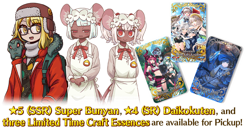 In "Limited Time Learning with Manga! FGO Collaboration Event Friend Point Summon", in addition to the cards normally appearing in Friend Point Summon, Craft Essence EXP Cards "★4 (SR) Super Bunyan Appears" and "★3 (R) Daikokuten & Anning Appear" that greatly strengthen Craft Essences will also be summonable.