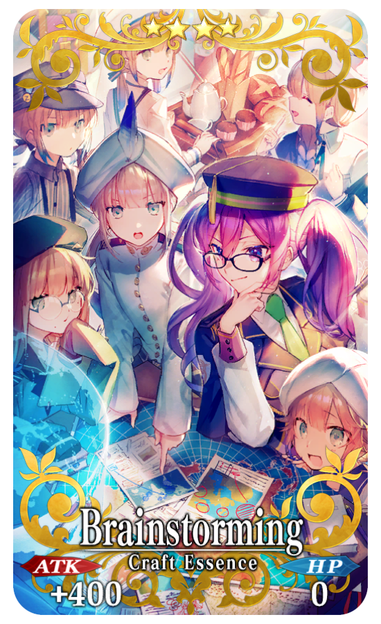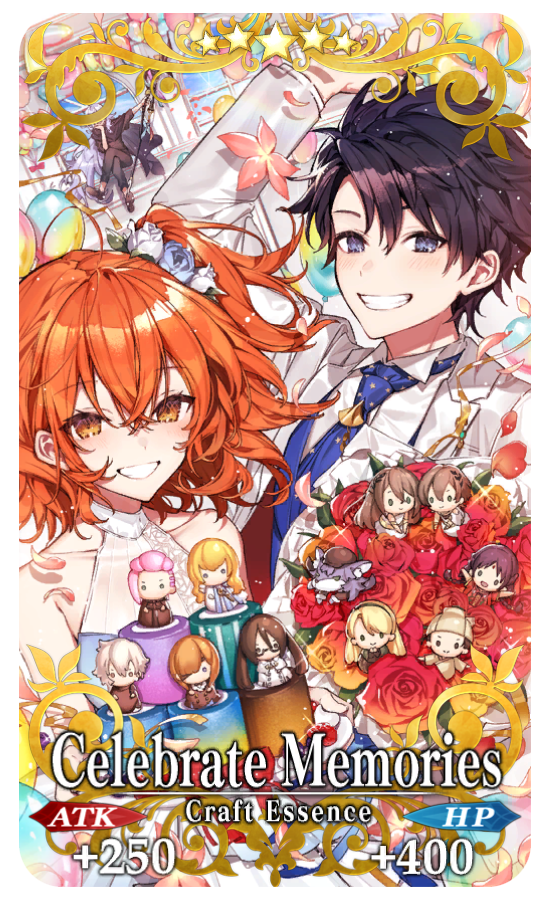 ▼Limited Time Craft Essences - ★5 (SSR) Celebrate Memories - ★4 (SR) Brainstorming - ★3 (R) Filler Flowers