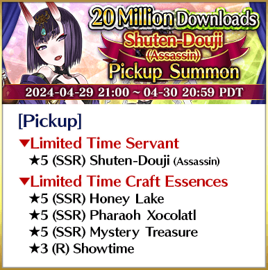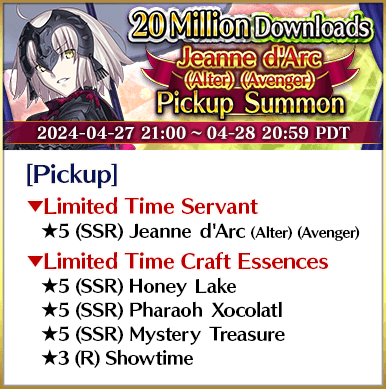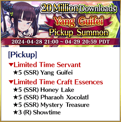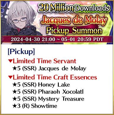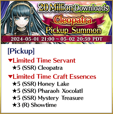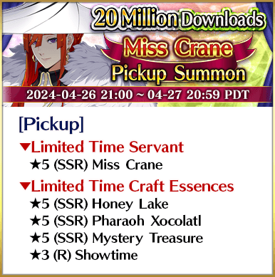 To celebrate over 20 million total downloads, Limited Time Servants ★5 (SSR) Miss Crane, ★5 (SSR) Jeanne d'Arc (Alter) (Avenger), ★5 (SSR) Yang Guifei, ★5 (SSR) Shuten-Douji (Assassin), ★5 (SSR) Jacques de Molay, and ★5 (SSR) Cleopatra will be featured in six Pickup Summons on a daily rotation!