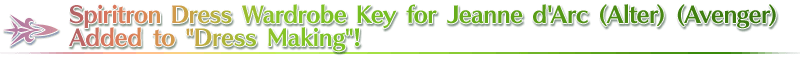 * Please note that although it is possible to obtain the Spiritron Dress Wardrobe Key even if you do not have ★5 (SSR) Jeanne d'Arc (Alter) (Avenger), you cannot unlock the Spiritron Dress.