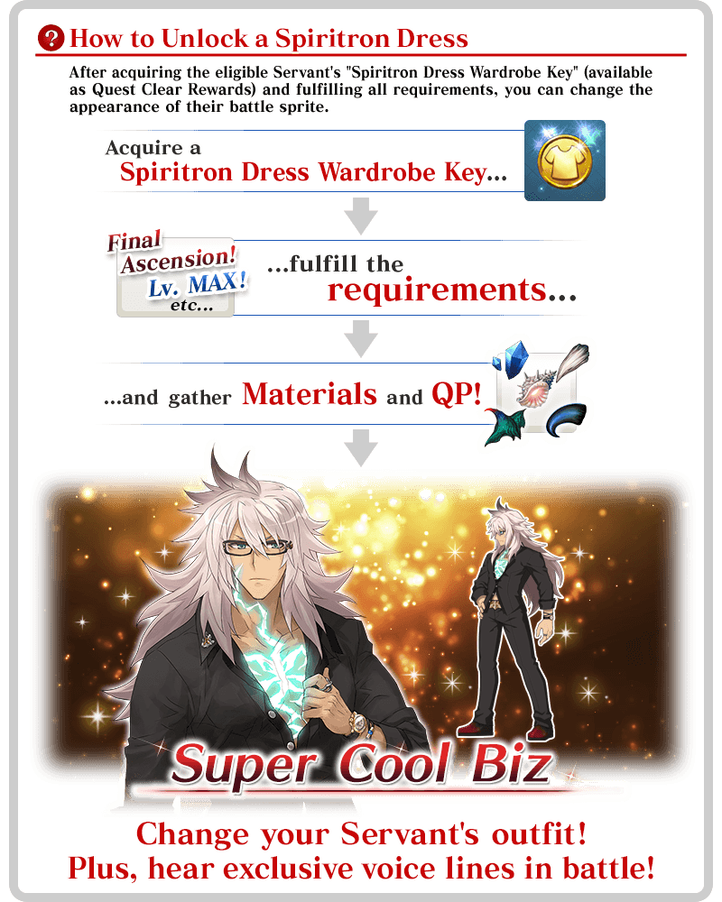 * Upon unlocking a Spiritron Dress, the Servant's battle sprite and icons will automatically be changed. You can revert back to the original appearance or change to a different Ascension level from the Servant Details screen. * "Unlock Wardrobe" will only change the eligible Servant's appearance. Their class and all other parameters will remain the same.