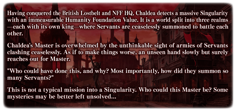 The stage for "Realm of the Thanatos Impulse, Traum - Life and Death of an Illusion" is a massive Singularity where three kings reigning over three realms lead their armies of Servants in a war. On a battlefield with many entangled motivations, confront the shadow of a great evil acting behind the scenes!