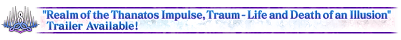 The official trailer for Part 2 Chapter 6.5 "Realm of the Thanatos Impulse, Traum - Life and Death of an Illusion" is now available on YouTube. * The trailer will be played when you first open the game between 2024-05-13 01:00 - 06-09 20:59 PDT (GMT -7). * The trailer will be added to Material after it is played, but it will be removed at the end of the period listed above.