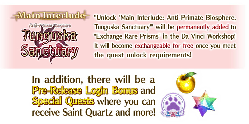 Unlock "Main Interlude: Anti-Primate Biosphere, Tunguska Sanctuary" will be permanently added to "Exchange Rare Prisms" in the Da Vinci Workshop. * "Main Interlude: Anti-Primate Biosphere, Tunguska Sanctuary" is a partially adjusted version of the 2023 Limited Time Event "Anti-Primate Biosphere, Tunguska Sanctuary".