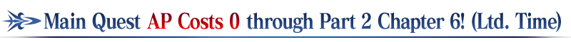 During the period below, Main Quests through Part 2 Chapter 6 will have their AP costs reduced to 0! Masters who still have Main Quests to clear, be sure to take advantage of this great chance to progress in the Main Story without consuming AP!