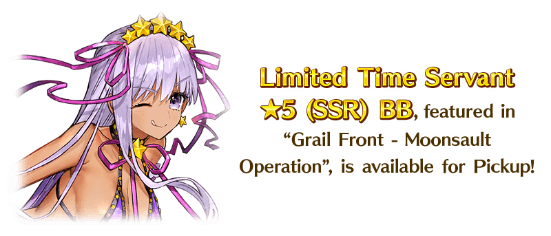 From the Servants related to the Limited Time Event "Grail Front - Moonsault Operation", Limited Time Servant "★5 (SSR) BB" will be available for Pickup!