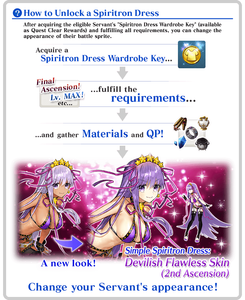 "Unlock Wardrobe" can be accessed from the Enhancement screen. * Upon unlocking a Spiritron Dress, the Servant's battle sprite and icons will automatically be changed. You can revert back to the original appearance or change to a different Ascension level from the Servant Details screen. * "Unlock Wardrobe" will only change the eligible Servant's appearance and voice lines. Their class and all other parameters will remain the same.