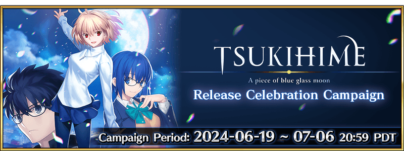 To celebrate the global release of "TSUKIHIME -A piece of blue glass moon-" on 2024-06-27 PDT (GMT -7), we'll be holding the "TSUKIHIME" Global Release Celebration Campaign.