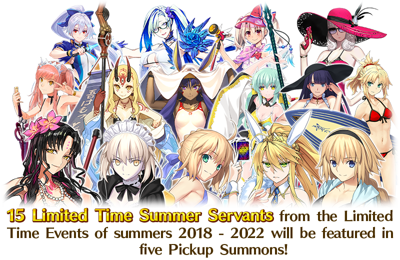 15 Limited Time swimsuit Servants related to summer Limited Time Events from 2018 - 2022 will be available for Pickup in five Summons!