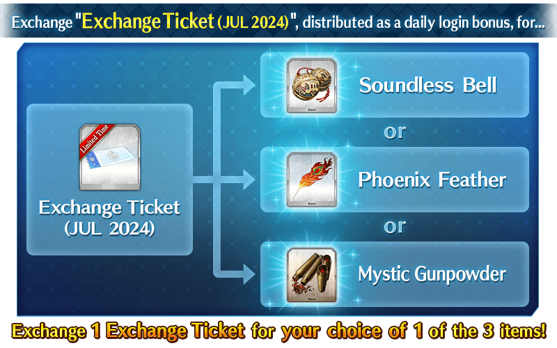 The "Exchange Ticket (JUL 2024)" distributed as a daily login bonus will be exchangeable for the following items.