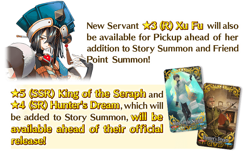 Furthermore, new Servant "★3 (R) Xu Fu" will also be available for Pickup. Plus, "★5 (SSR) King of the Seraph" and "★4 (SR) Hunter's Dream", which are destined for Story Summon, will also be available ahead of their official release!