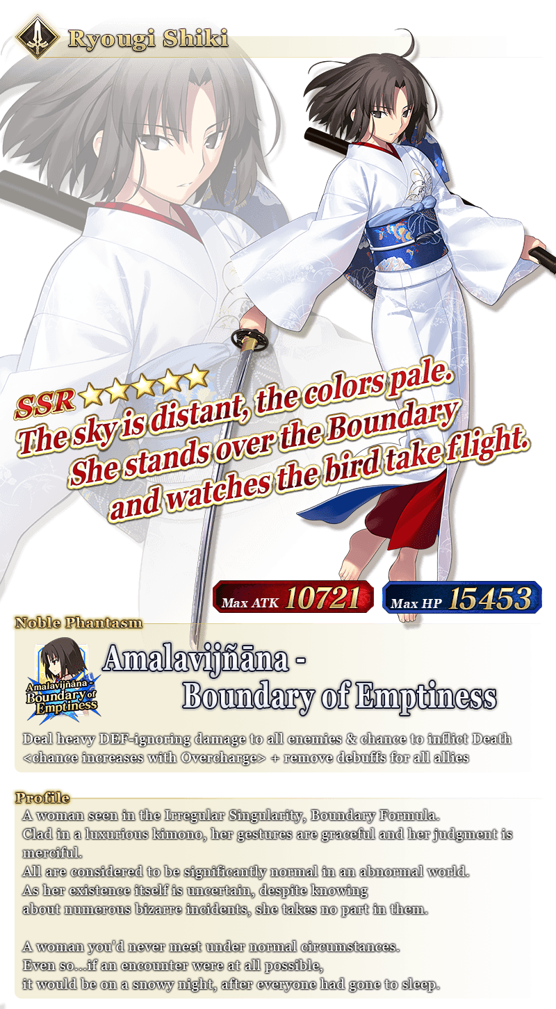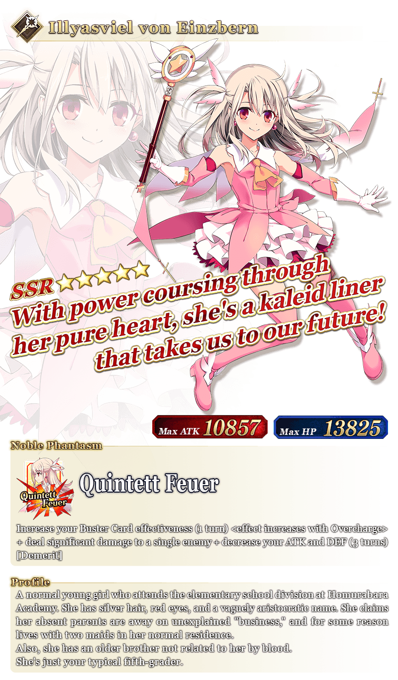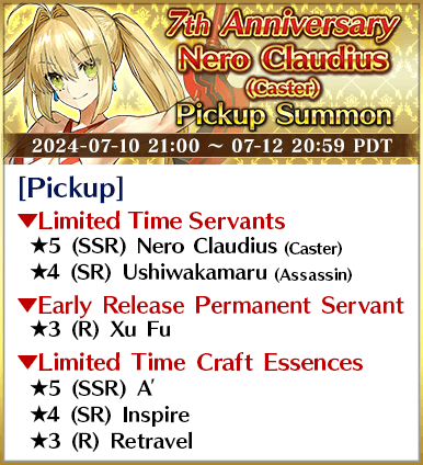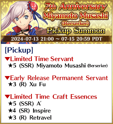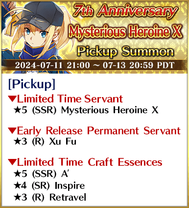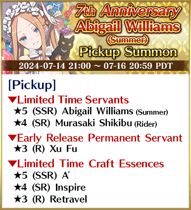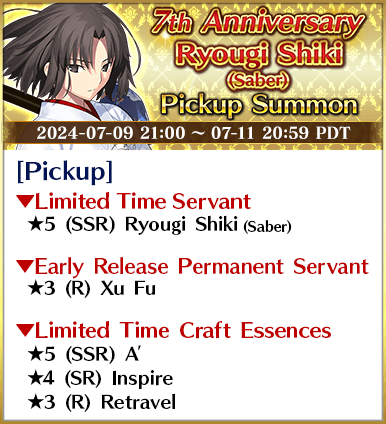 About Featured Servants: * The following Servant(s) will only be summonable from the Summon Lineup(s) where they are featured as Pickup Servant(s). Please be sure to confirm the lineup before summoning. - ★5 (SSR) Ryougi Shiki (Saber) - ★5 (SSR) Illyasviel von Einzbern (Caster) - ★5 (SSR) Nero Claudius (Caster) - ★5 (SSR) Mysterious Heroine X - ★5 (SSR) Miyamoto Musashi (Berserker) - ★5 (SSR) Abigail Williams (Summer) - ★5 (SSR) Voyager - ★4 (SR) Murasaki Shikibu (Rider) - ★4 (SR) Ushiwakamaru (Assassin) * The following Servant(s) will not be added to Story Summon after the Pickup Summon period ends. - ★5 (SSR) Ryougi Shiki (Saber) - ★5 (SSR) Illyasviel von Einzbern (Caster) - ★5 (SSR) Nero Claudius (Caster) - ★5 (SSR) Mysterious Heroine X - ★5 (SSR) Miyamoto Musashi (Berserker) - ★5 (SSR) Abigail Williams (Summer) - ★5 (SSR) Voyager - ★4 (SR) Murasaki Shikibu (Rider) - ★4 (SR) Ushiwakamaru (Assassin) * The following Servant(s) will be added to Story Summon and Friend Point Summon after the "7th Anniversary Archetype: EARTH Pickup Summon" ends. - ★3 (R) Xu Fu * Servants added to Story Summon through story progression will not be summonable. Please be sure to confirm the lineup before summoning.