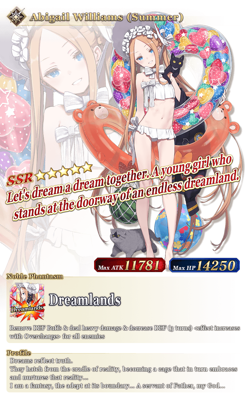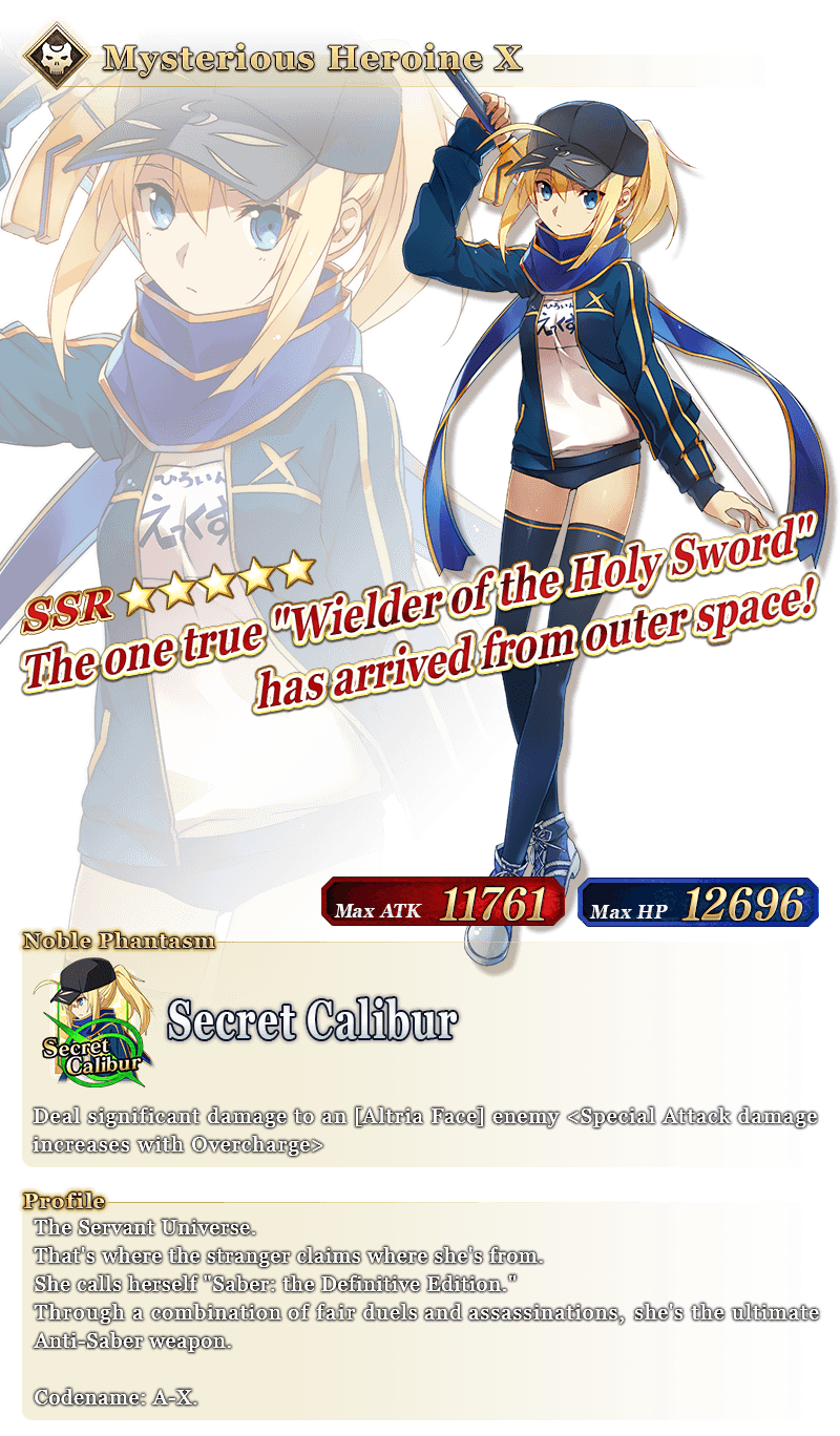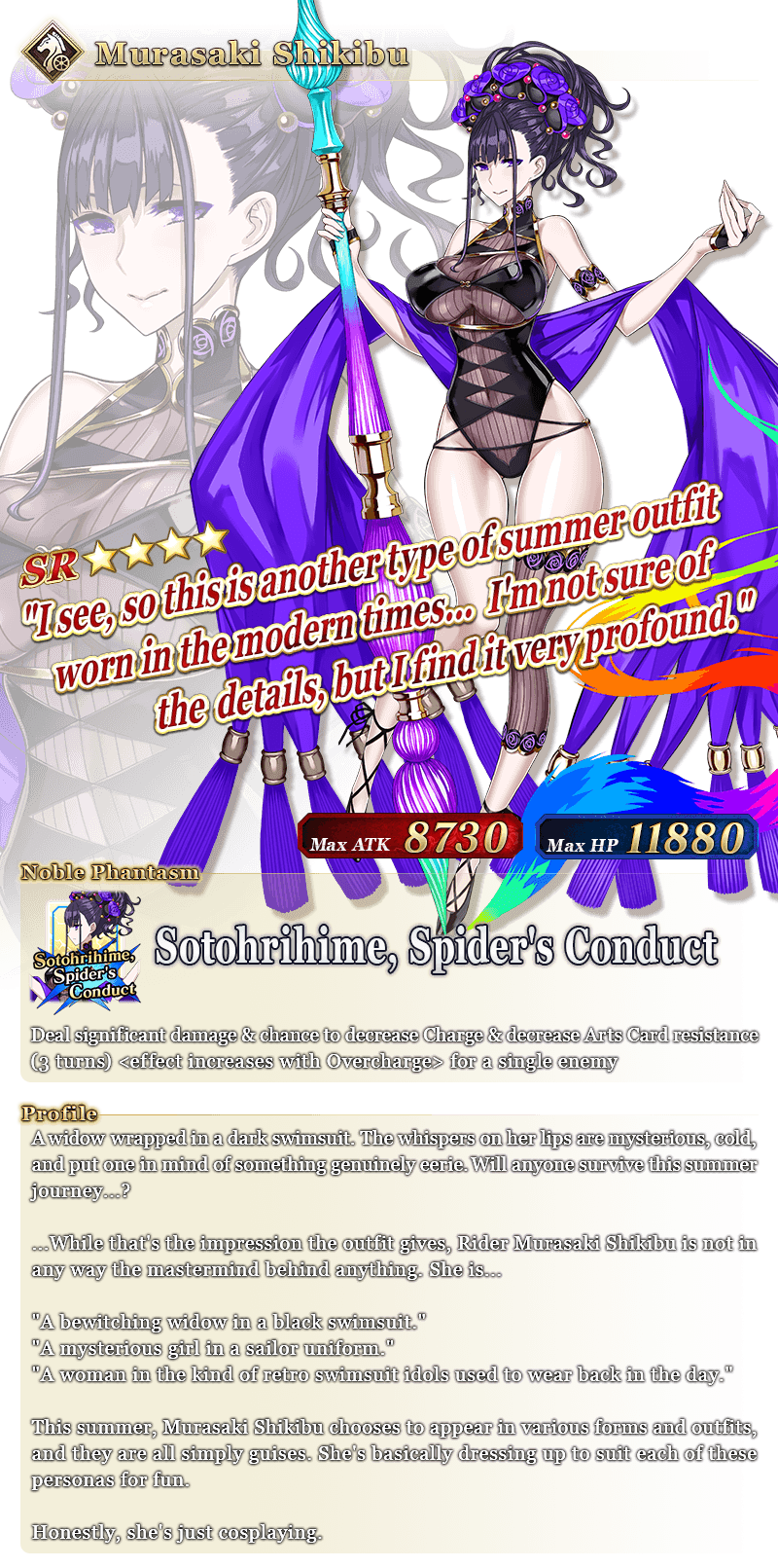 About Featured Servants: * The following Servant(s) will only be summonable from the Summon Lineup(s) where they are featured as Pickup Servant(s). Please be sure to confirm the lineup before summoning. - ★5 (SSR) Ryougi Shiki (Saber) - ★5 (SSR) Illyasviel von Einzbern (Caster) - ★5 (SSR) Nero Claudius (Caster) - ★5 (SSR) Mysterious Heroine X - ★5 (SSR) Miyamoto Musashi (Berserker) - ★5 (SSR) Abigail Williams (Summer) - ★5 (SSR) Voyager - ★4 (SR) Murasaki Shikibu (Rider) - ★4 (SR) Ushiwakamaru (Assassin) * The following Servant(s) will not be added to Story Summon after the Pickup Summon period ends. - ★5 (SSR) Ryougi Shiki (Saber) - ★5 (SSR) Illyasviel von Einzbern (Caster) - ★5 (SSR) Nero Claudius (Caster) - ★5 (SSR) Mysterious Heroine X - ★5 (SSR) Miyamoto Musashi (Berserker) - ★5 (SSR) Abigail Williams (Summer) - ★5 (SSR) Voyager - ★4 (SR) Murasaki Shikibu (Rider) - ★4 (SR) Ushiwakamaru (Assassin) * The following Servant(s) will be added to Story Summon and Friend Point Summon after the "7th Anniversary Archetype: EARTH Pickup Summon" ends. - ★3 (R) Xu Fu * Servants added to Story Summon through story progression will not be summonable. Please be sure to confirm the lineup before summoning.