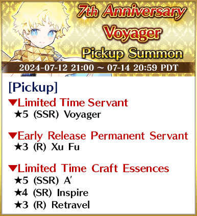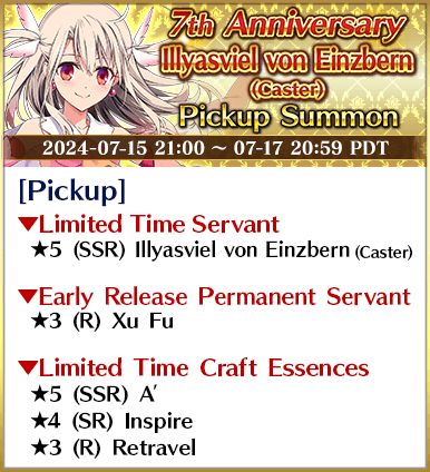 The following will also be ongoing for a limited time: - Fate/Grand Order 7th Anniversary - 7th Anniversary Archetype: EARTH Pickup Summon - 7th Anniversary Guaranteed Summon (Class Specific × 20 Groups) Please see the articles linked below for more information.