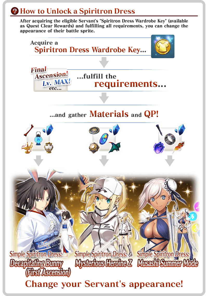 * Upon unlocking a Spiritron Dress, the Servant's battle sprite and icons will automatically be changed. You can revert back to the original appearance or change to a different Ascension level from the Servant Details screen. * "Unlock Wardrobe" will only change the eligible Servant's appearance and voice lines. Their class and all other parameters will remain the same.