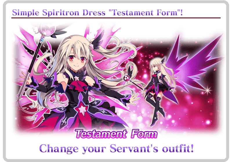 The Wardrobe Key for the Simple Spiritron Dress "Testament Form" for ★5 (SSR) Illyasviel von Einzbern (Caster) will become free to exchange in "Dress Making" in the Da Vinci Workshop once you have cleared Final Singularity!
