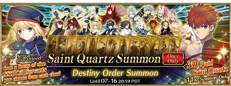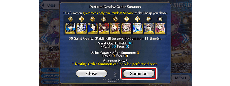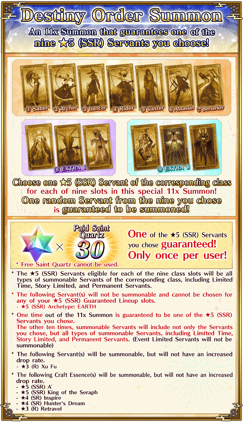 One random Servant from the ★5 (SSR) Servants you selected is guaranteed to be summoned! Please note that "Destiny Order Summon" will be available only once per user, for a cost of 30 Paid Saint Quartz.