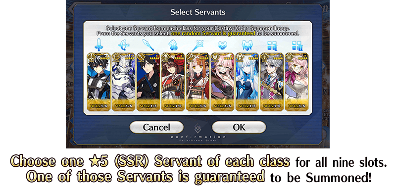 * The Servants summonable from "Destiny Order Summon" will be the nine ★5 (SSR) Servants you chose and all ★5 (SSR), ★4 (SR), and ★3 (R) Servants, including Limited Time Servants and excluding Servants distributed through events.