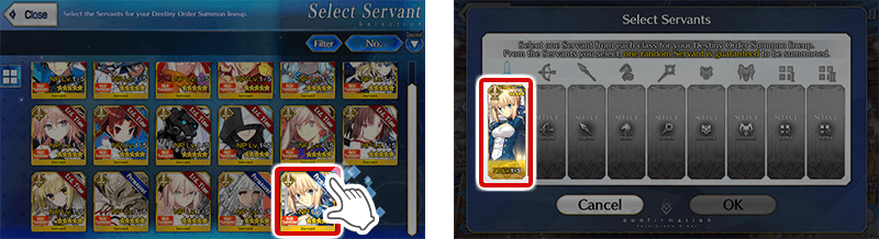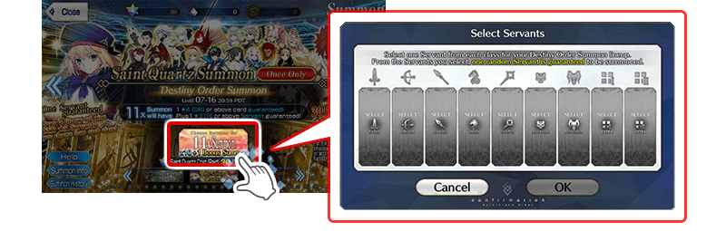 Only selectable ★5 (SSR) Servants will be displayed. Choose one Servant from among them for each Guaranteed Summon Eligible Slot.
