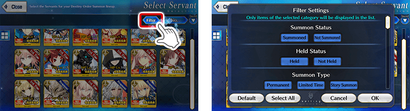 Tap the "Filter" button on the upper right of the Select Servant screen to filter which Servants are displayed by whether or not you have summoned them before, Noble Phantasm Type, etc.