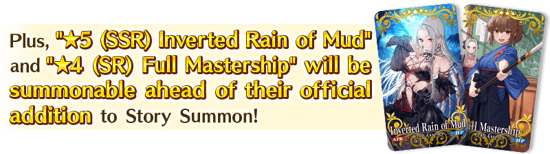 In addition, Craft Essences featuring the Pickup Servants will also be available for Pickup in some of the Pickup Summons. Plus, new Craft Essences "★5 (SSR) Inverted Rain of Mud" and "★4 (SR) Full Mastership" will also be summonable ahead of their official addition to Story Summon!