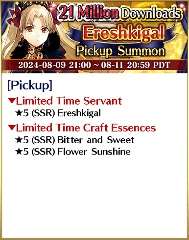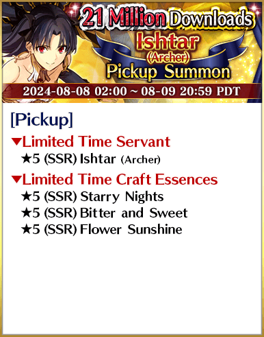 The following will also be ongoing for a limited time: - 21 Million Downloads Campaign - 21 Million Downloads Space Ishtar Pickup Summon Please see the articles linked below for more information.