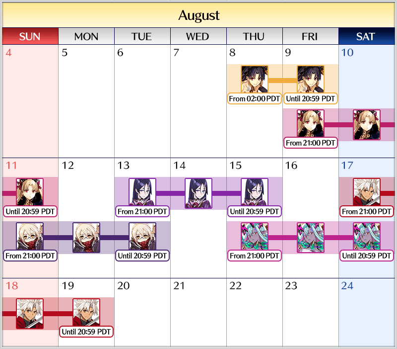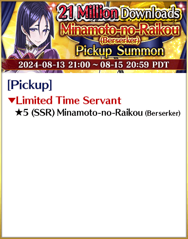 * Bonus Summons will be calculated separately for each Summon Lineup. * Please note that the Summon Period for each Pickup Summon will differ. * In this Summon, only the Pickup ★5 (SSR) Servant in each individual Summon will be eligible for the "Guaranteed Summon" feature.