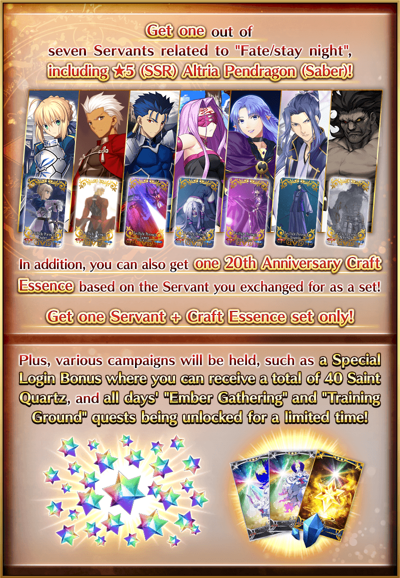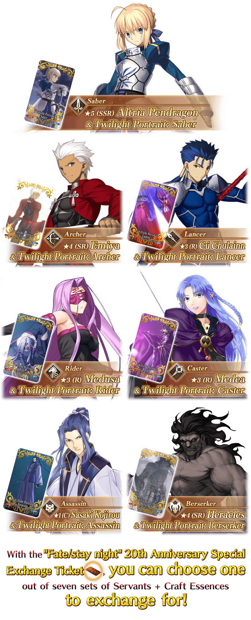 Servants & "Fate/stay night" 20th Anniversary Craft Essences Eligible for Exchange: