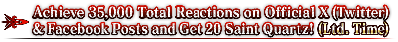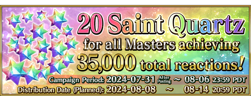 If you can get the "Get one out of seven 'Fate/stay night' Servants and one 20th anniversary Craft Essence!" posts on the Fate/Grand Order Official X (Twitter) and Facebook to 35,000 combined total reactions during the period below, we'll distribute 20 Saint Quartz!