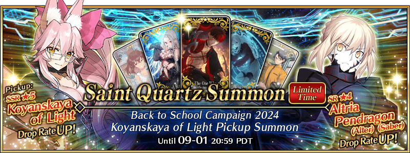 The following will also be ongoing for a limited time: - Back to School Campaign 2024 Koyanskaya of Light Pickup Summon Please see the article linked below for more information.