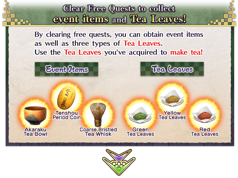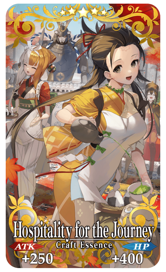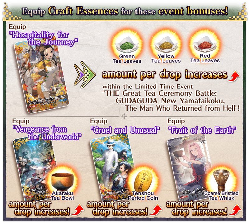 Equip the Event Limited Craft Essence "★5 (SSR) Hospitality for the Journey", available through Event Item Exchange and Cha-no-yu Points rewards, to receive a bonus to the amount per drop of Green Tea Leaves, Yellow Tea Leaves, and Red Tea Leaves within the Limited Time Event "THE Great Tea Ceremony Battle: GUDAGUDA New Yamataikoku, The Man Who Returned from Hell".