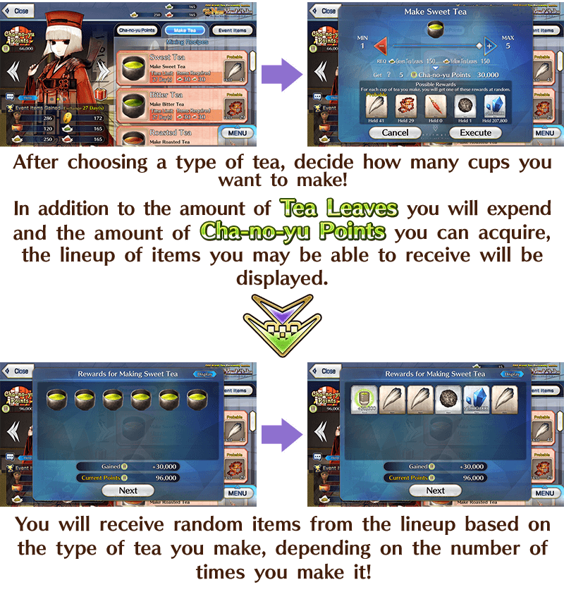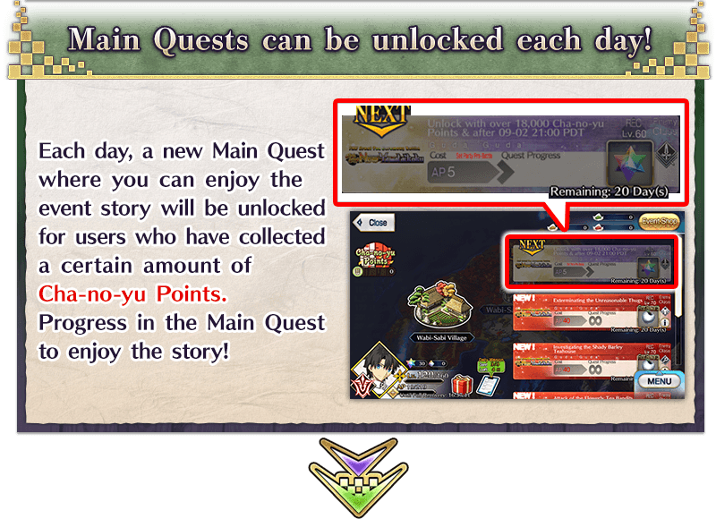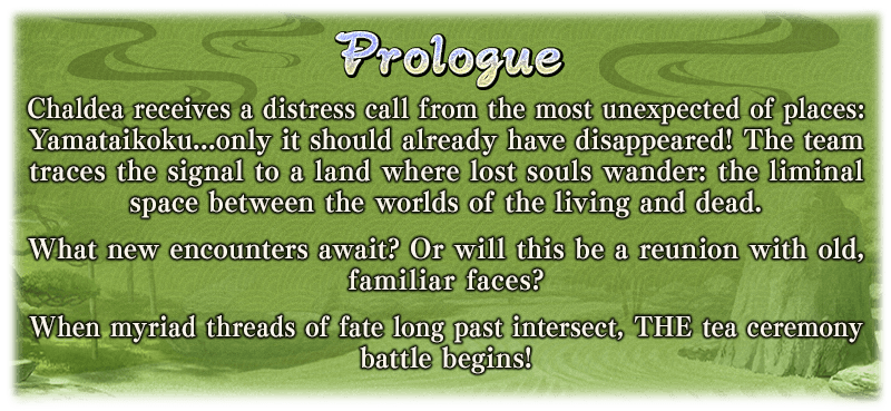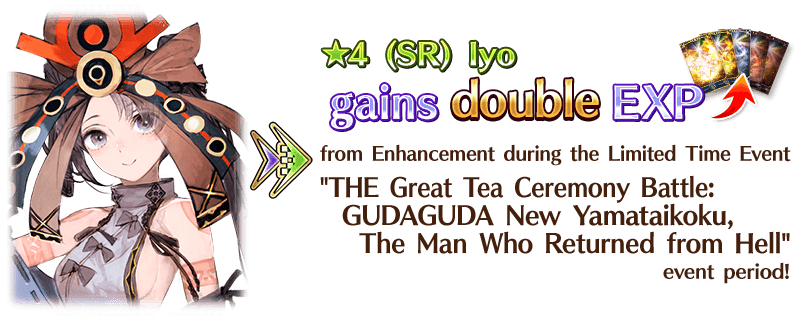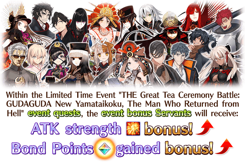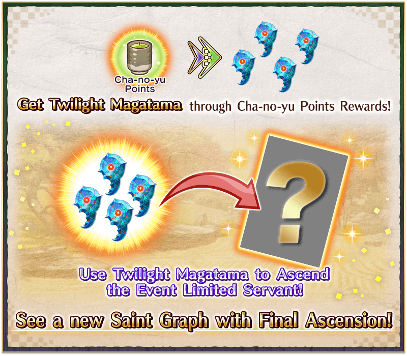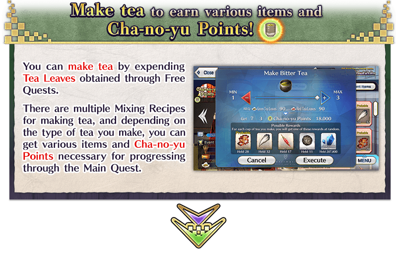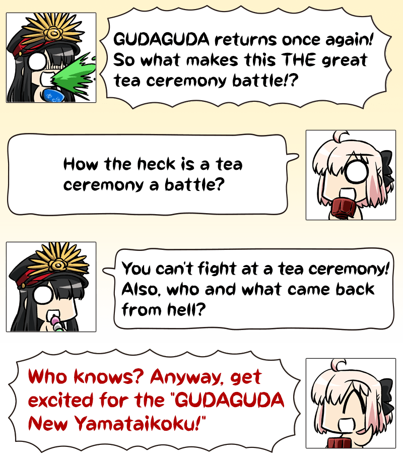 In the Limited Time Event "THE Great Tea Ceremony Battle: GUDAGUDA New Yamataikoku, The Man Who Returned from Hell", you can make tea to earn "Cha-no-yu Points" and various items needed to progress through the event's Main Quest.