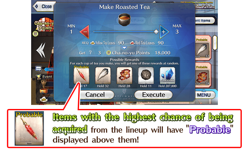 You can see a lineup of obtainable items on the screen where you choose how much tea to make. Items that have the highest chance of being awarded when making tea will have "Probable" displayed above them.