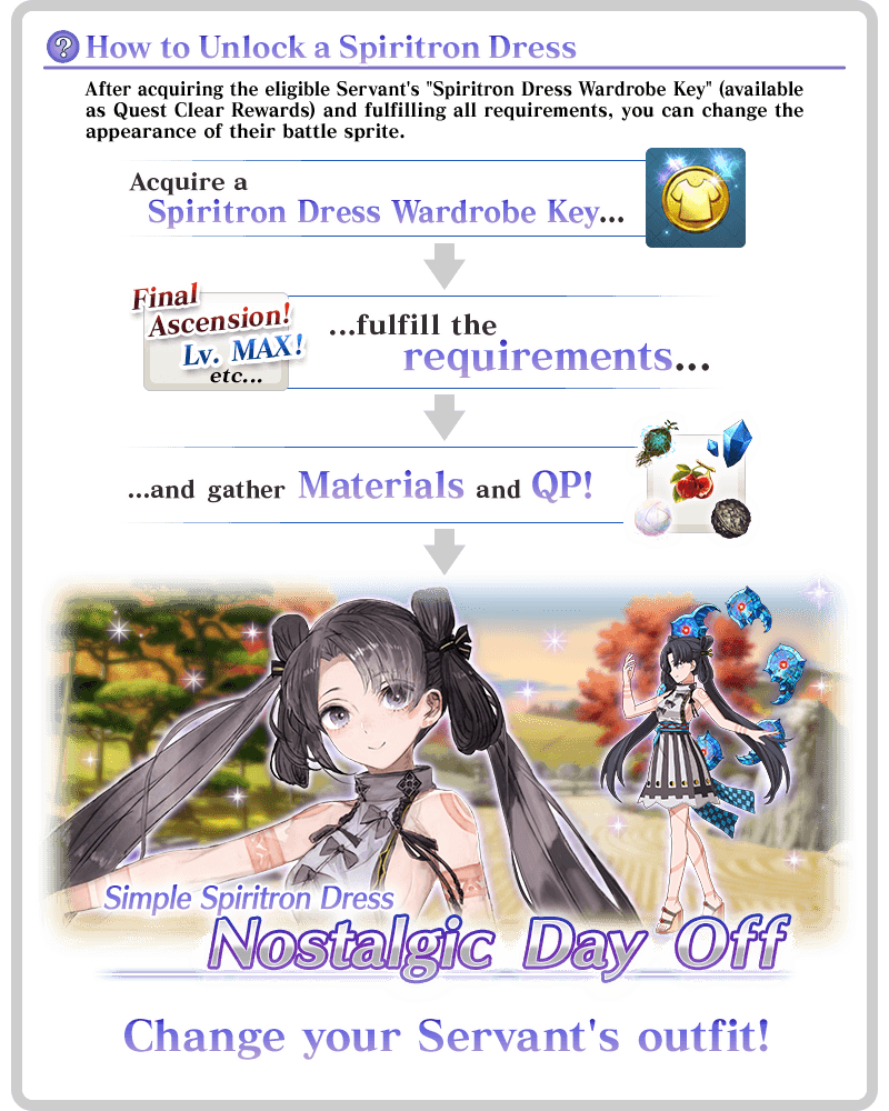 * Upon unlocking a Spiritron Dress, the Servant's battle sprite and icons will automatically be changed. You can revert back to the original appearance or change to a different Ascension level from the Servant Details screen.