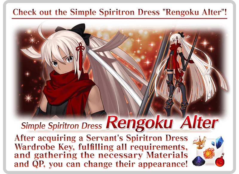 The Wardrobe Key for the Simple Spiritron Dress "Rengoku Alter" for ★5 (SSR) Okita Souji (Alter) (Alter Ego) will be available as a reward within the Limited Time Event "THE Great Tea Ceremony Battle: GUDAGUDA New Yamataikoku, The Man Who Returned from Hell"!