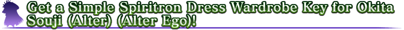 About the Spiritron Dress Wardrobe Key: * The Spiritron Dress Wardrobe Key for ★5 (SSR) Okita Souji (Alter) (Alter Ego) can be acquired only during the event period of the Limited Time Event "THE Great Tea Ceremony Battle: GUDAGUDA New Yamataikoku, The Man Who Returned from Hell". * The Simple Spiritron Dress for ★5 (SSR) Okita Souji (Alter) (Alter Ego) will change her Servant name, appearance, and voice lines. * Please note that although it is possible to obtain the Spiritron Dress Wardrobe Key even if you do not have ★5 (SSR) Okita Souji (Alter) (Alter Ego), you cannot unlock the Spiritron Dress.